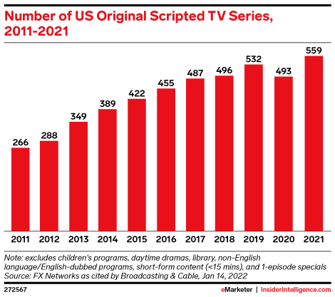 There were 559 original scripted TV series made in the US in 2021, according to FX Networks. That’s more than twice the number made a decade prior.