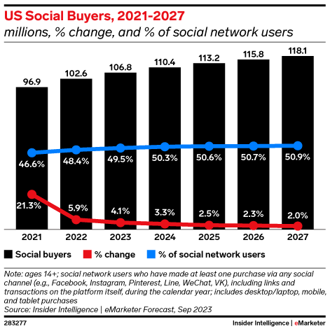 Sales are quickly approaching $100 billion. Gen Z’s influence on social media habits, new commerce technologies from TikTok, and rising annual spending by buyers are the main factors driving growth. And with users now spending just shy of 2 hours on social media per day, there is plenty of room for brands and users to squeeze more sales.