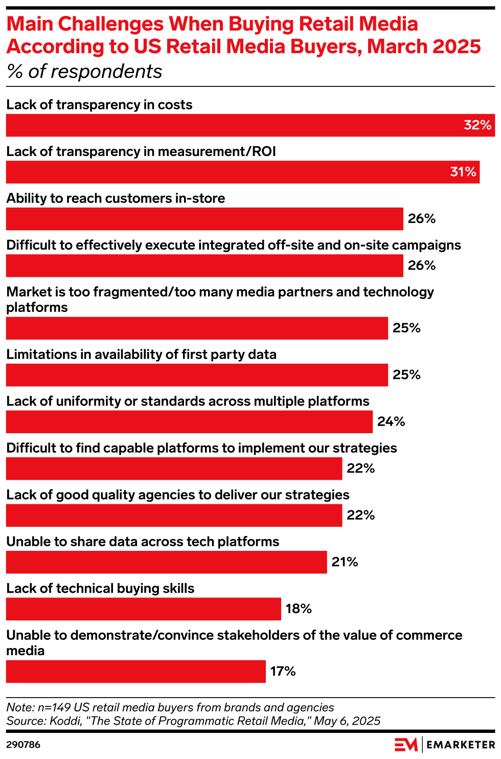 The news: Retail media infrastructure firm Topsort is helping major retailers like Woolworths, Kohl’s, and Magalu grow ad revenues by 60% in a single month, per CEO Regina Ye. Topsort’s Data Genie tool converts billions of data points into instant insights and replaces legacy analytics systems that delay campaign execution. Our take: With budget exhaustion, measurement complexity, and system fragmentation among top buyer complaints, retailers are eager to modernize. Topsort’s AI-powered tools offer transparency, speed, and flexibility—values that align closely with where the market is heading. The bigger question: Will fall product updates bring true interoperability or further entrench silos?