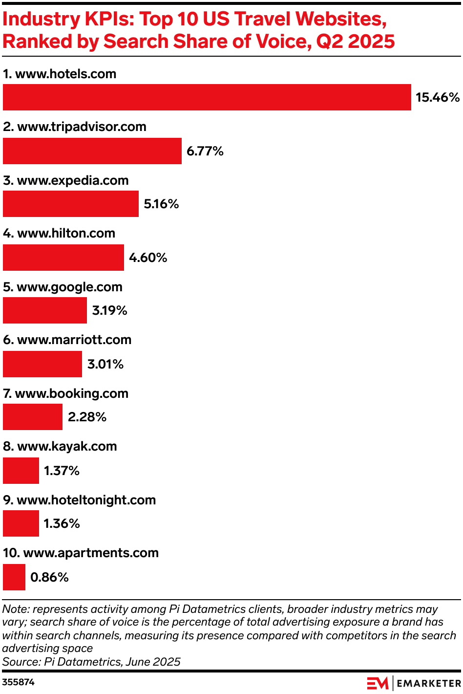 Big websites like Hotels.com, Tripadvisor, and Expedia appeared most often in Q2 2025 travel searches, showing the influence of scale.