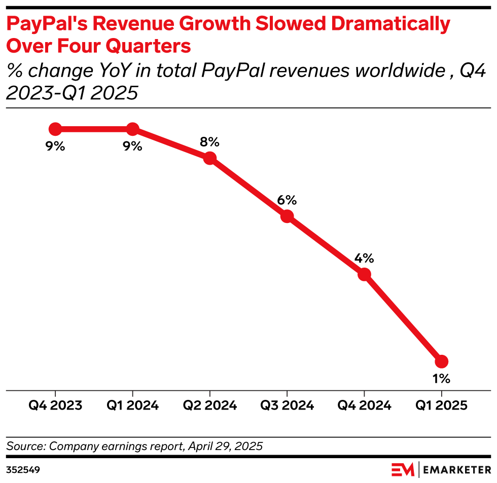 The news: PayPal posted net revenue growth of 5% YoY at $8.3 billion due to strong performances of Venmo, its debit card, and Braintree, per its earnings report. Our take: PayPal is leaning into its branded experience and tech innovations to power its way through 2025.