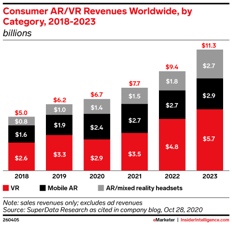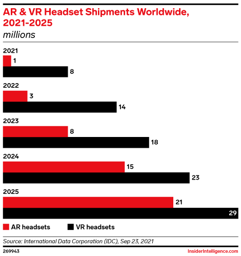 Virtual reality content revenues worldwide will jump from $2.16 billion in 2021 to $8.31 billion in 2025.