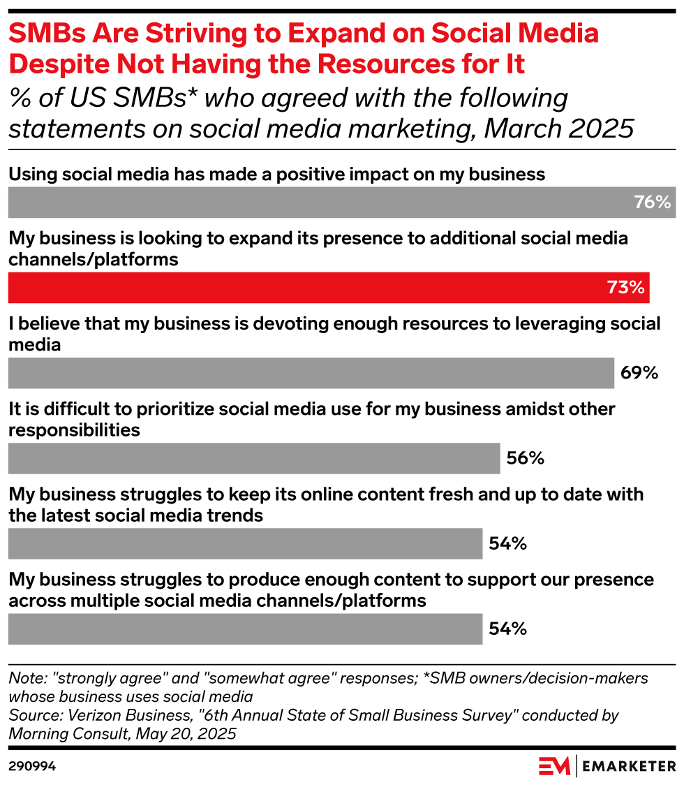 The news: Small- and medium-size businesses (SMBs) are increasingly relying on social media as a key marketing tool—but over half are struggling to keep up with the rapidly evolving landscape. Over three-quarters of small business leaders state that using social media has made a positive impact on their business—but 56% find it difficult to prioritize social media use, and 54% struggle to produce enough content to support multiple social media channels. Our take: Keeping up with social media’s future requires SMBs to integrate it as a core business function rather than viewing social media as an afterthought.
