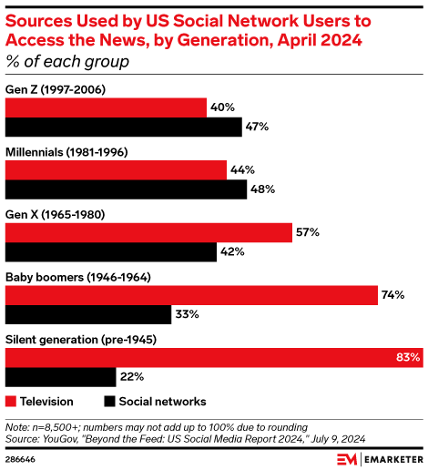 They are YouTube, TikTok, Instagram, and Snapchat. There are also more Gen X social network users than linear TV viewers, and YouTube is closing in.